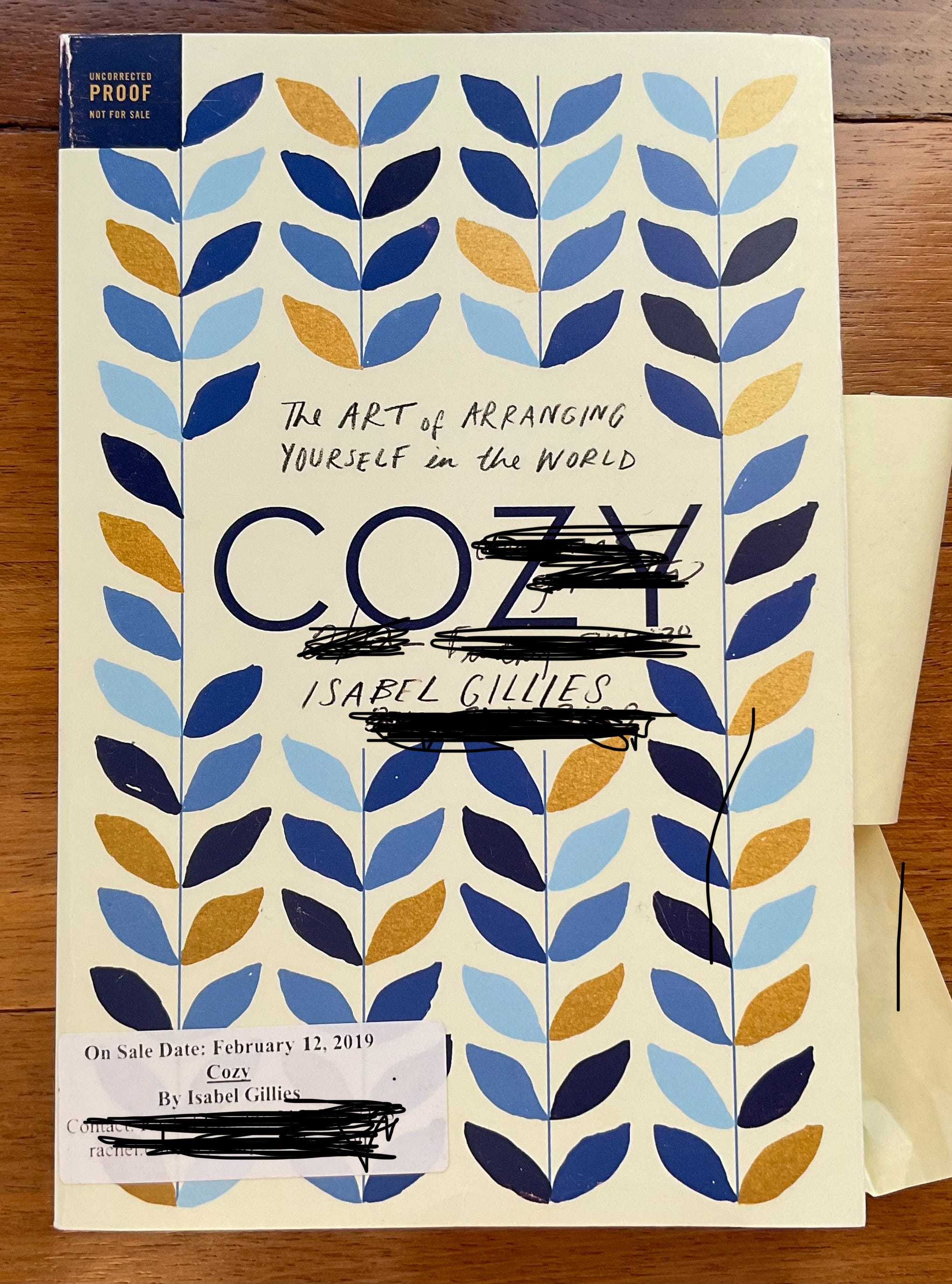 In the interview, we chat about Isabel’s book Cozy. I reached out to Isabel’s publisher for a galley of the book, a pre-publication copy of the book for media and reviewers and loved the book. The publisher also agreed to send me out a copy of the hardcover version of the book when it released. The cover on the final copy of the book is absolutely gorgeous. I believe Isabel’s friend designed it for her. It sits on my coffee table to this day. (See Pic Above). Below is a picture of the galley.